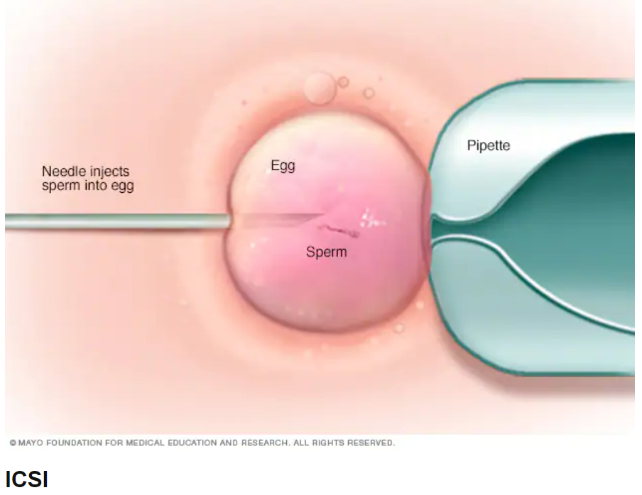 Intracytoplasmic sperm injection (ICSI) - in ICSI, a single healthy sperm is injected directly into each mature egg. ICSI is often used when semen quality or number is a problem or if fertilization attempts during prior IVF cycles failed.